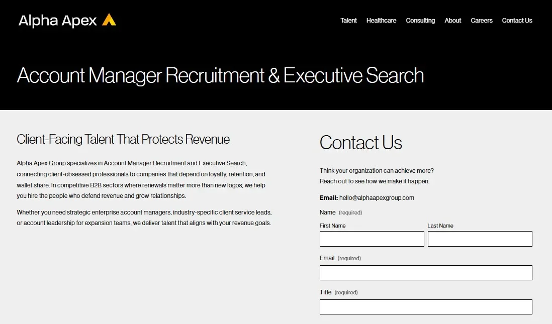 Alpha Apex offers a specialized, research-driven recruitment method that targets proven high-performers in account management and gives businesses access to candidates who can immediately impact client retention, upsell opportunities, and revenue growth.