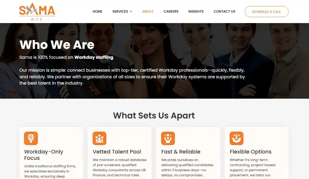 Sama is a boutique firm specializing exclusively in Workday staffing, consulting, and staff augmentation. They offer full‑time recruiting, integrations, customizations, and training around Workday HCM (and other modules).