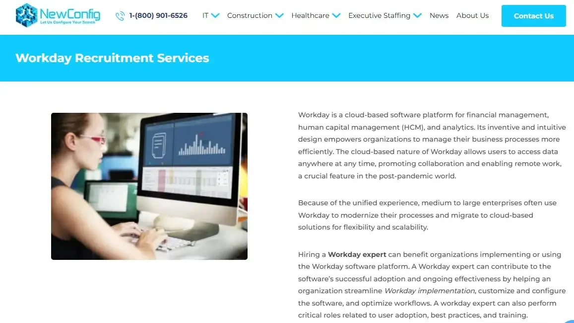 NewConfig is a recruitment agency with a specialized Workday staffing practice. They help organizations using Workday recruit and hire talent to manage/optimize the Workday software platform (HCM, recruiting, payroll, etc.).