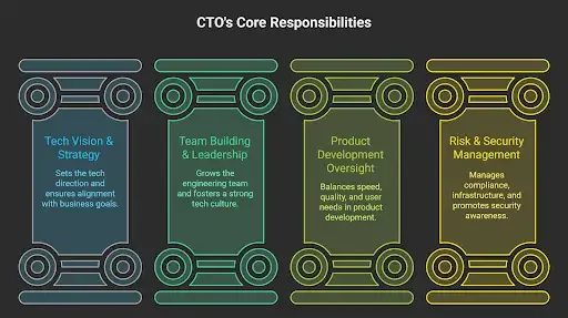 A CTO is responsible for the growth, structure, and output of your entire engineering organization. They define roles, identify leadership potential, and build a performance-driven culture.