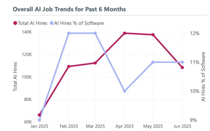 At the same time, job postings for AI roles nearly doubled, jumping from around 66,000 to almost 139,000 between January and April 2025.