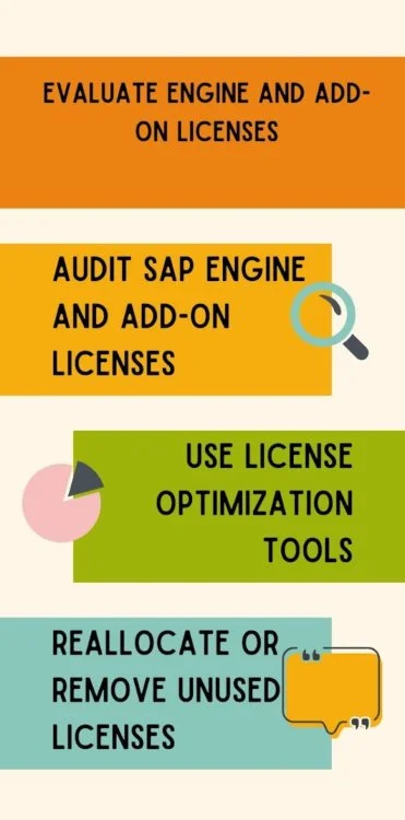 Effectively managing SAP licenses requires a thorough evaluation of both engine and add-on licenses to identify and eliminate unnecessary expenditures. SAP engines are specialized modules that perform specific functions, such as SAP Payroll Processing, which is licensed based on the number of master records, or SAP E-Recruiting, which depends on the number of employees.