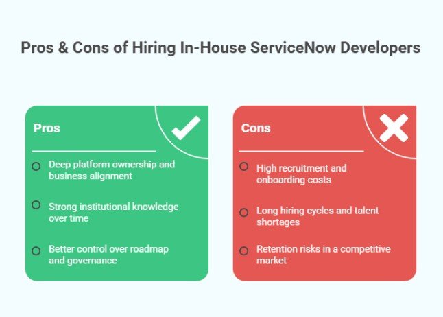 Now that you know the benefits, it’s just as important to look at the trade-offs. These are the main challenges to weigh before committing fully to an in-house ServiceNow hiring model: