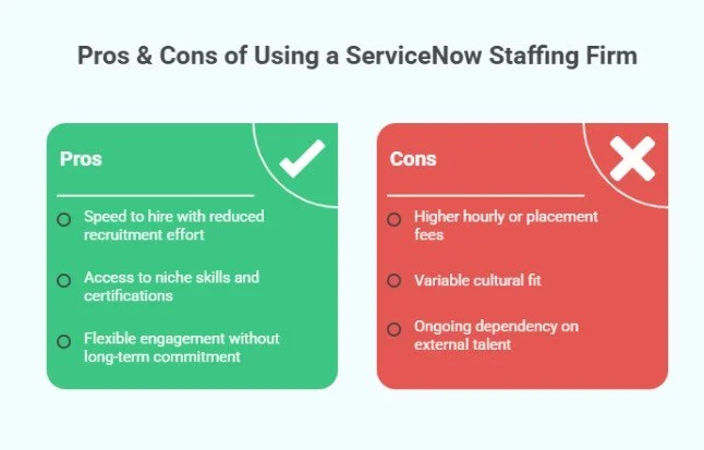 Hard-to-find ServiceNow expertise: Certain certifications or niche platform skills are difficult to source through traditional recruitment. Staffing firms help you access specialized talent without extended search cycles.