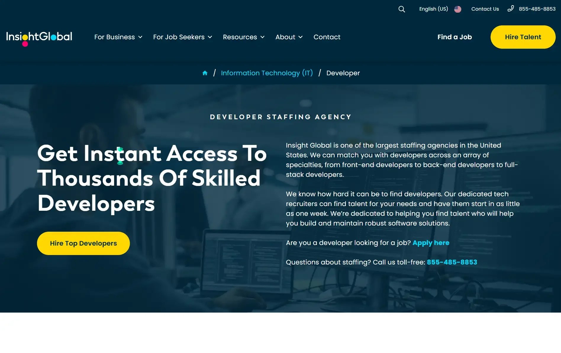 Insight Global: Insight Global taps into an enormous candidate database to deliver developers in as little as 24–48 hours, with a pay-after-hire model that keeps hiring low-risk and high-reward.