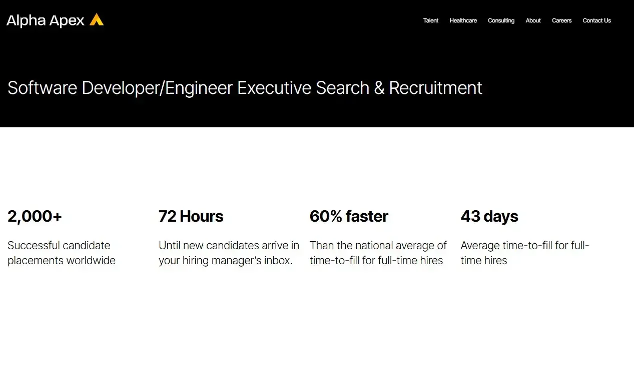 Alpha Apex Group: Alpha Apex Group delivers engineers 60% faster than the national average, with an 80% placement success rate and 50-75% lower costs by combining a pre-vetted talent pool with custom-built pipelines tailored to your roadmap. We bring another layer of trust with a 90-day replacement guarantee.