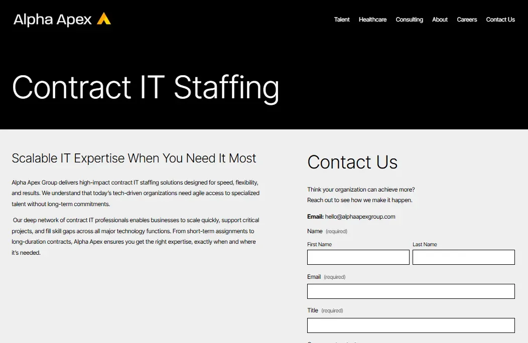Contact Alpha Apex Group today to secure specialized, leadership-level IT talent that drives performance, ensures compliance, and keeps your projects ahead of schedule.