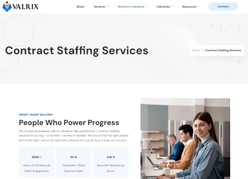 Valrix reports more than 2000 hours of engagement, a 95% candidate retention rate, and recruiter satisfaction scores of 4.8 out of 5. It also notes that 93% of their contract-to-hire placements convert to full-time roles.