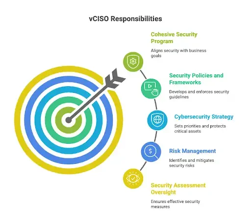 A vCISO develops and enforces security policies, frameworks, and roadmaps that evolve with the organization’s growth. They act as the architect of cybersecurity strategy, setting priorities and defining how to protect critical assets. Responsibilities often include risk management, policy creation, and security assessment oversight.