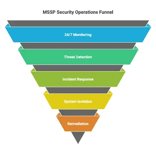 Unlike general IT providers, MSSPs specialize exclusively in cybersecurity consulting and operational defense. Their services include 24/7 threat monitoring, incident response, and device management.