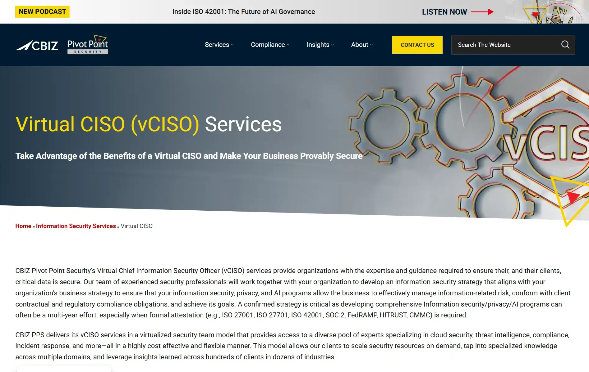 Pivot Point Security provides virtual CISO leadership designed around compliance-heavy environments. Their vCISO service is built to help organizations meet and prove adherence to demanding frameworks like ISO 27001, SOC 2, FedRAMP, HITRUST, and CMMC. That’s critical in industries where client trust and contractual obligations hinge on certification and audit readiness.