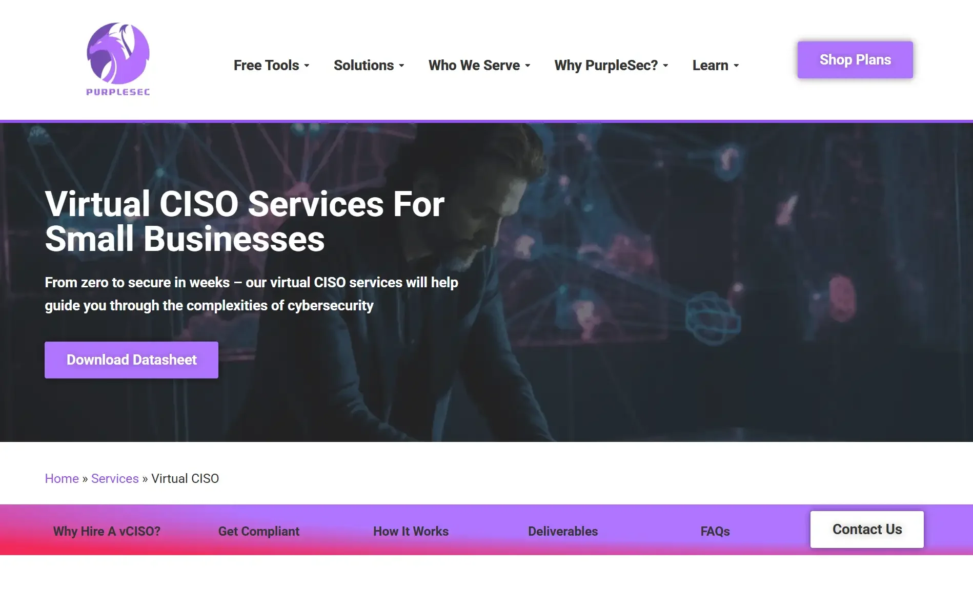 PurpleSec offers virtual CISO services built to give smaller organizations like startups and SMBs executive‑level cybersecurity leadership without the high cost or commitment of a full‑time CISO.
