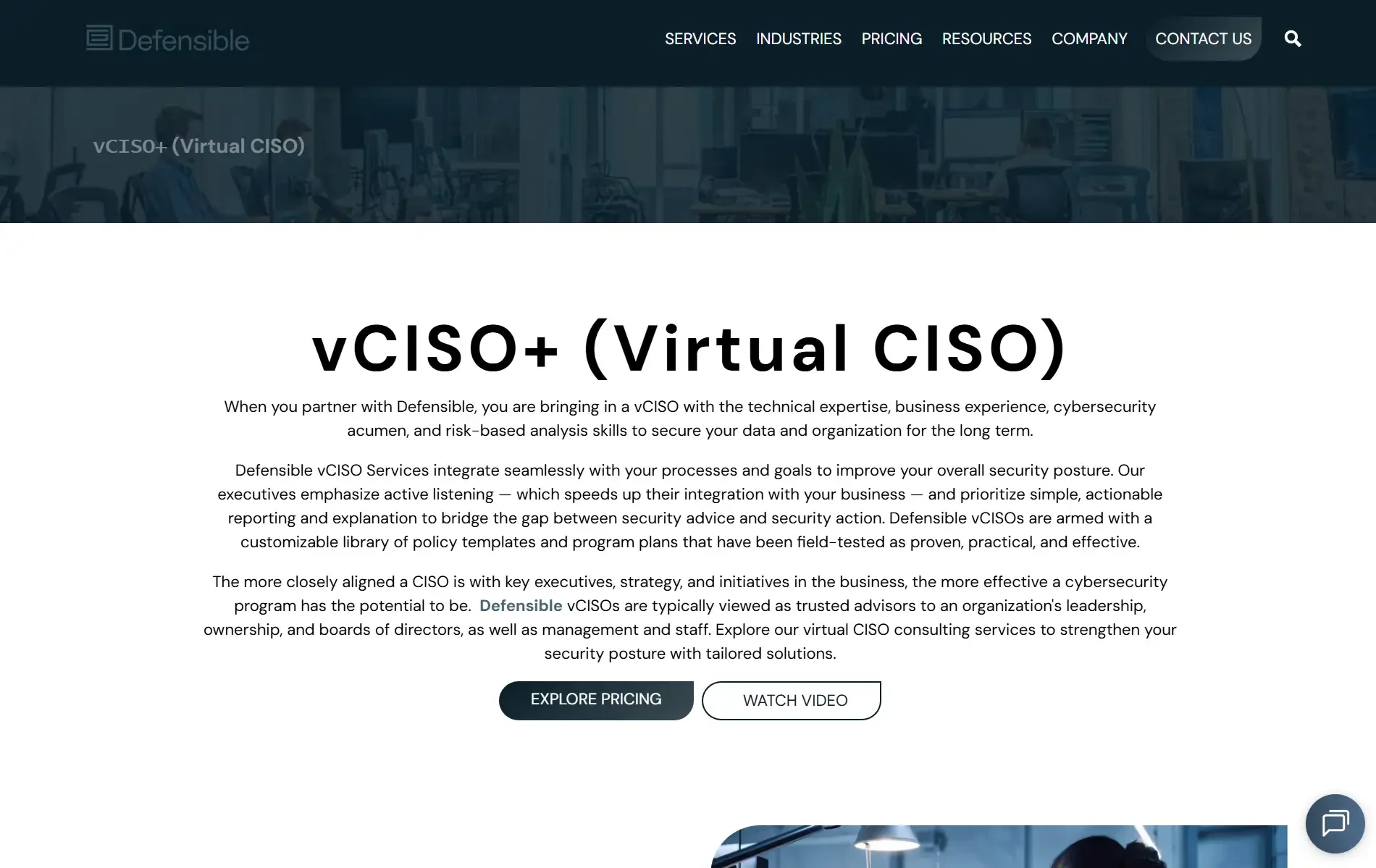 Defensible Technology delivers its vCISO+ service as a way for organizations to gain executive-level security leadership with the advantage of pre-tested frameworks and actionable execution support.