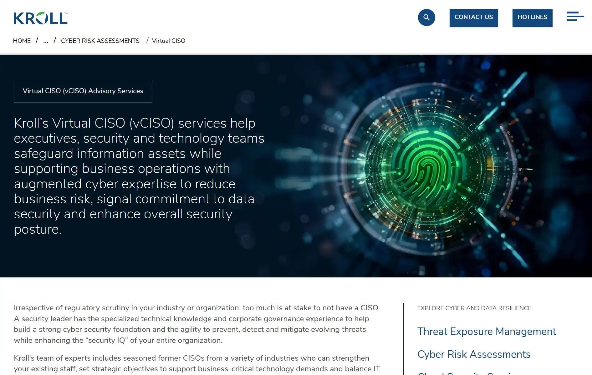 For leadership teams under pressure, Kroll offers something particularly valuable: translation. Their vCISOs bridge technical and business language, which means conversations about risk land with clarity and accountability at the board level. This makes them a strong fit for organizations that deal with complex compliance obligations or heightened stakeholder scrutiny.