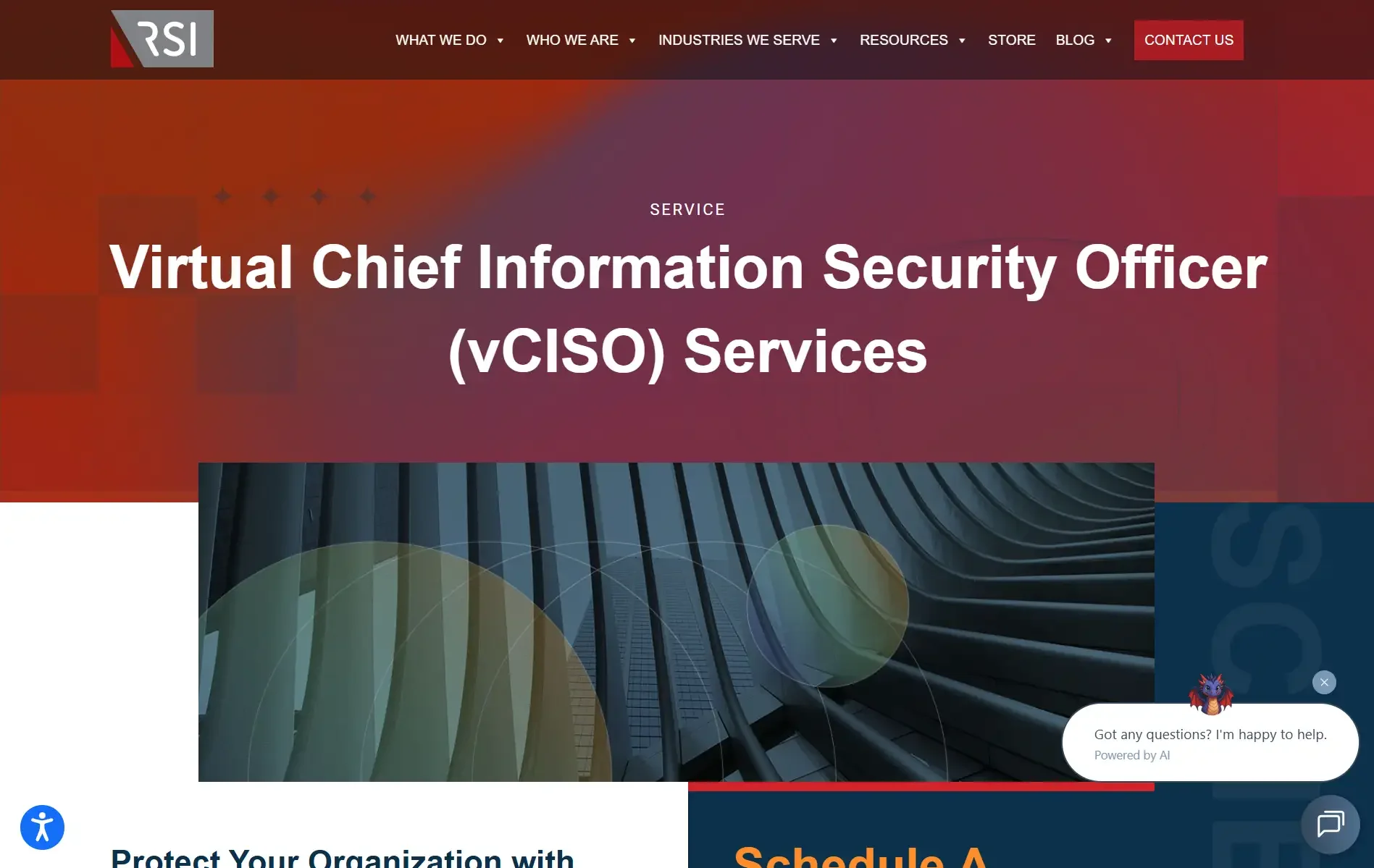 RSI Security provides virtual CISO (vCISO) services for companies that want senior‑level cybersecurity leadership without hiring a full‑time CISO.